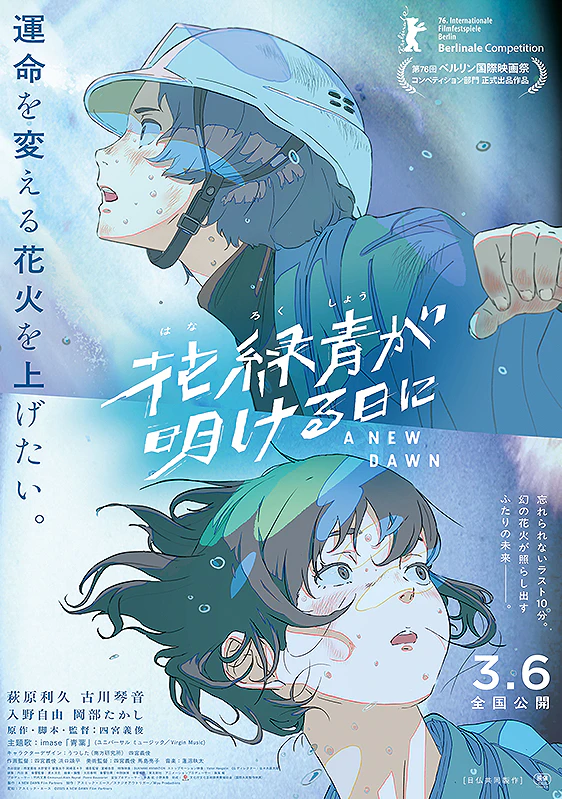 日本動畫電影《花緑青が明ける日に》由藝術家四宮義俊首度執導長篇動畫,並與法國動畫公司 Miyu Productions 共同製作。故事圍繞一間擁有330年歷史的老字號煙火工廠,在城市再開發計畫下即將被迫關閉。一直守在工廠中的青年帶刀敬太郎,努力完成父親留下的「幻之煙火」。當離開家鄉多年的青梅竹馬式森薰回到小鎮,兩人重新面對過去的傷痕與未完成的約定。隨著神秘藍色顏料「花綠青」的秘密逐漸揭開,一段關於記憶與時間的故事也慢慢展開。