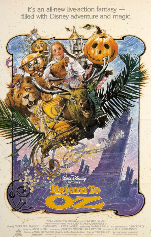 《Return to Oz》(1985)是一部由 Walt Disney Pictures 製作的奇幻冒險電影,由 Walter Murch 執導,Fairuza Balk 主演。故事延續經典電影《The Wizard of Oz》的世界觀,講述桃樂絲再次回到奧茲國時,發現這個魔法國度已經被邪惡力量摧毀。她必須與新朋友合作,對抗統治奧茲的邪惡女王,並拯救翡翠城。電影改編自 L. Frank Baum 的小說系列,雖然風格比1939年的版本更加黑暗,但也成為奇幻電影中的獨特作品。