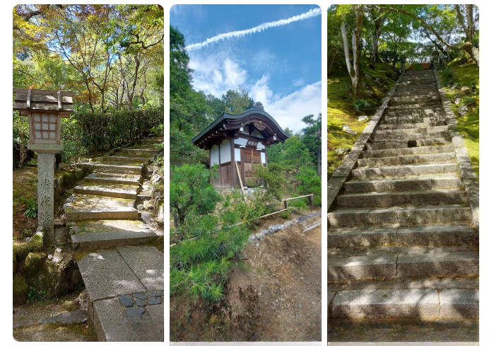 石階沿著山坡向上延伸,兩側是樹木與苔蘚覆蓋的地面。陽光透過枝葉灑落在石階上,形成明暗交錯的光影。沿著這些石階前行,遊客會逐漸進入寺院與山林深處。這樣的山道在京都寺院中非常常見,既是通往建築的道路,也是一段能夠放慢腳步的旅程。每一級石階都帶著歲月痕跡,使整條路徑顯得古老而自然。