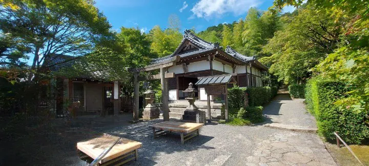古老的木造山門矗立在石階前方,門上的匾額顯示出寺院悠久的歷史。深色木材與瓦屋頂形成典型的日本寺院建築風格。山門後方延伸著碎石步道與林間道路,帶領遊客走進寺院深處。兩側樹木與石牆圍繞著入口,使整個空間充滿莊嚴氣氛。當人們穿過山門時,彷彿離開城市喧鬧,進入一個安靜的宗教空間。這種山門與庭院結構是日本寺院建築的重要特色。