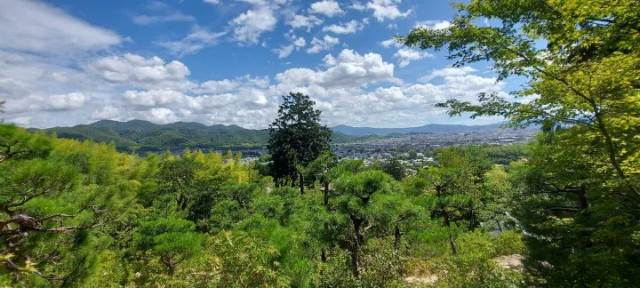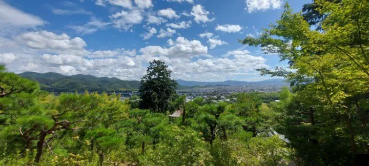 從嵐山山坡的展望位置,可以看到京都盆地與遠方山脈。綠色松樹與竹林覆蓋山坡,遠處城市建築在藍天與白雲下顯得寧靜而開闊。這樣的景色讓人感受到京都城市與自然環境之間的連結。許多遊客會在這裡停留片刻,欣賞整個城市與山景交織的風景。