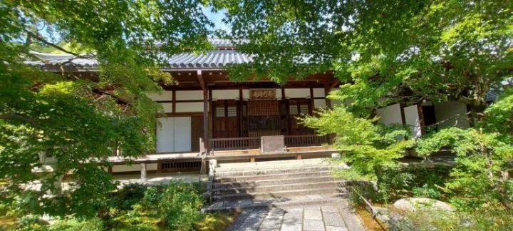 寺院庭院中的主殿建築面向石階與庭園,木造結構與瓦屋頂呈現典型的日本寺院風格。周圍楓樹與竹林環繞,使整個空間顯得清幽。木階與石板道路連接庭院與建築,使訪客可以慢慢走近主殿。這樣的寺院空間通常用於參拜或舉行宗教儀式。