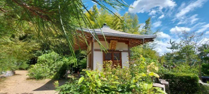 嵐山山坡上的小佛堂被竹林與綠色植物包圍,木造建築在陽光下顯得格外安靜。屋頂瓦片與木門保持著傳統寺院風格,周圍的小徑與草木讓整個空間充滿自然氣息。這類小型佛堂通常位於寺院庭園或山林之中,是京都寺院文化的一部分。遊客走在嵐山山道時,經常會在林間發現這樣的建築,使整段旅程充滿探索感。陽光透過樹葉灑落在建築與地面上,形成柔和光影,也讓整個環境呈現出寧靜而悠遠的氣氛。
