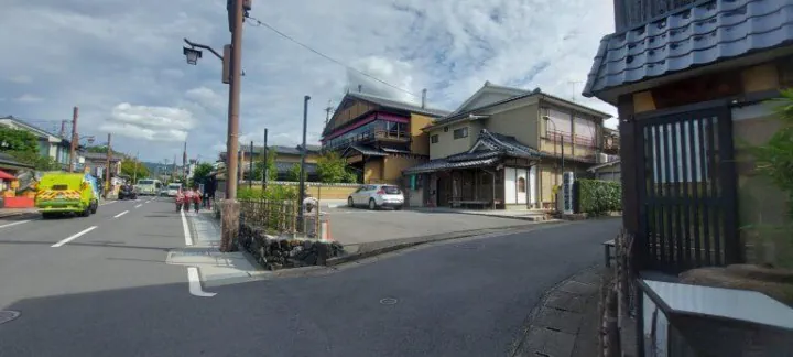 嵐山附近的住宅街道呈現出京都日常生活的一面。道路兩側是傳統風格與現代建築混合的住宅,電線與路燈沿著街道延伸。遠方可以看到山景與藍天,使整個城市與自然環境連接在一起。行人與汽車在街道上緩慢通行,形成一種平靜而真實的生活景象。對於旅人而言,這樣的街道不只是通往景點的路,也是一種觀察京都城市生活的方式。從這些住宅區走向山林寺院,彷彿逐漸進入另一個更安靜的世界。