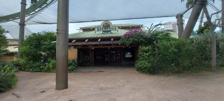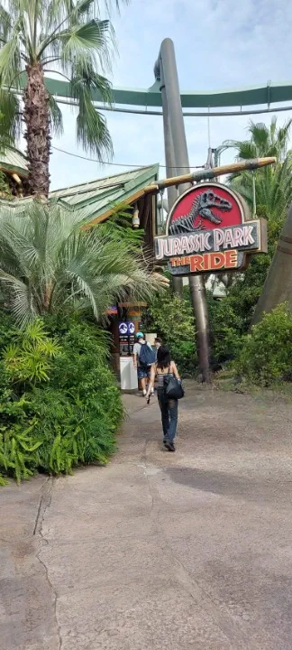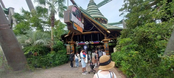 侏羅紀公園設施入口被熱帶植栽包圍,標誌高掛於木質結構之上。入口並不巨大,但辨識度極高。主題先於空間出現,讓參與者在踏入之前,已經完成情境轉換。