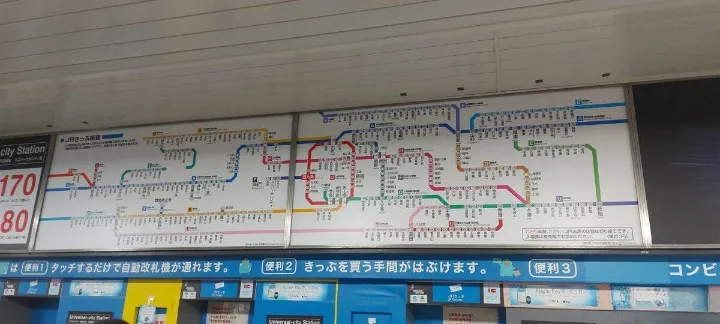 巨大的 JR 路線圖橫跨牆面,色線交錯,站名密集。這不只是地圖,而是大阪與關西地區的流動結構。不同顏色代表不同動脈,環狀線與支線彼此接合,形成高頻率的轉乘網絡。