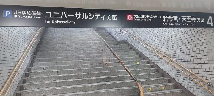 樓梯向上延伸,標示清楚寫著夢咲線與大阪環狀線方向。這些文字不只是目的地名稱,而是城市功能區的連結——商業區、住宅區、娛樂區,透過鐵路串接。