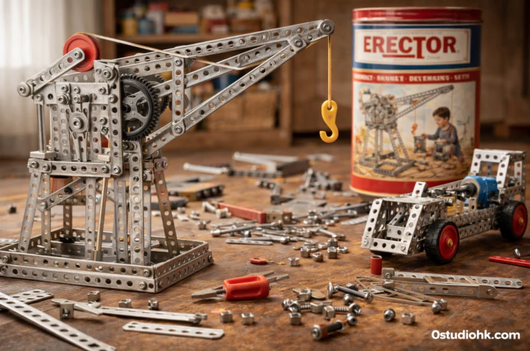 建造模型Erector Set以金屬零件組裝結構,啟發孩子對工程與機械的興趣,是經典的教育型建構玩具。