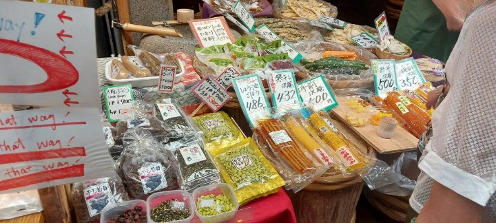 市場攤位上擺滿各式干菜與腌製食品,透明包裝與手寫標價牌讓顧客可以清楚看到商品種類與價格。從乾豆、腌菜到各種醬漬蔬菜,每一種食品都展示出日本保存食文化的特色。這些食材通常可以長時間保存,也常被用作日常餐桌上的配菜。