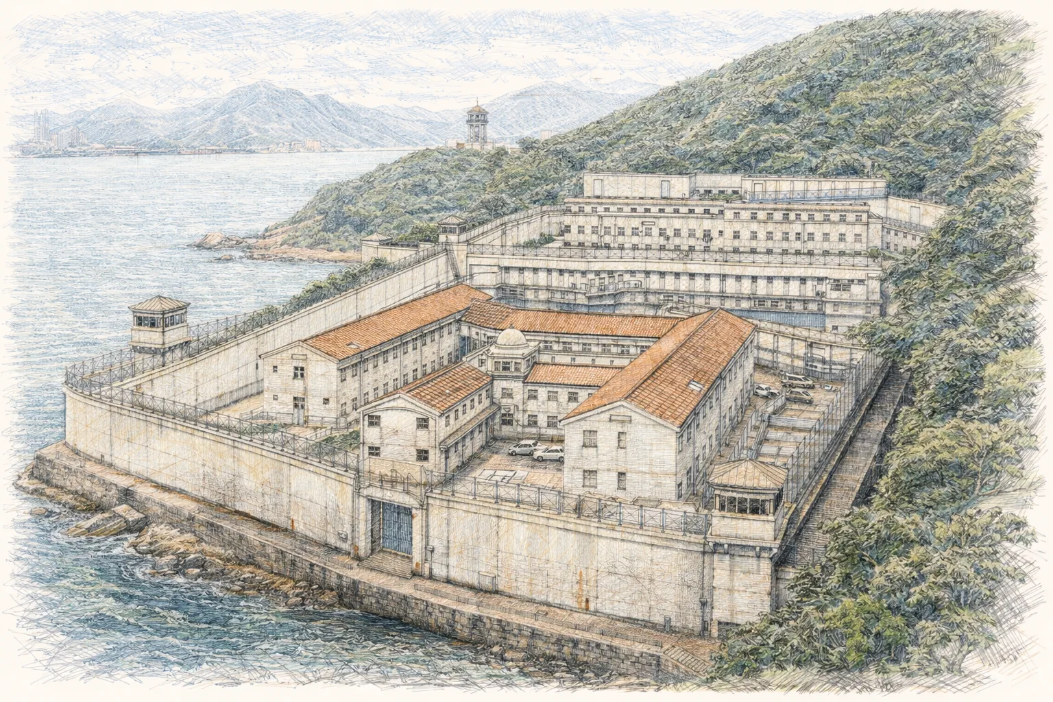 赤柱監獄位於香港的南端,靠近海岸線,是一個充滿矛盾與象徵意義的空間。它既不隱秘,也不顯眼,彷彿刻意被塑造成一個與城市主流生活隔絕的地帶。這座監獄的地理位置特點鮮明,四周環繞著藍天碧海,風景如畫。然而,這樣的自然美景與監獄內部的封閉與孤寂形成了強烈的反差。對於外界的人而言,這片遼闊的海洋象徵著自由與希望,但對於囚犯來說,它卻是遙不可及的背景,進一步強化了他們與自由之間的鴻溝。
